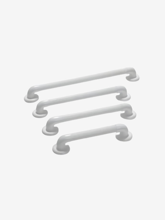 Barres d’appui à fixer au mur. Belle finition grâce aux cache-vis. Coudes en ABS et corps en PVC cannelé pour une meilleure tenue de la barre. Chevilles et vis non fournies à définir en fonction du mur support.