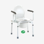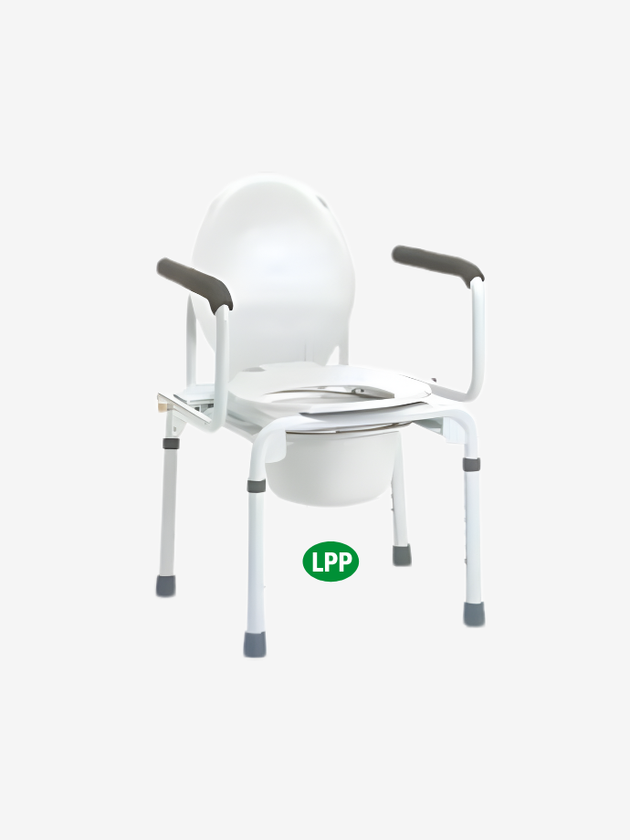 Chaise percée, sur-élévateur de toilettes et cadre de toilette. Accoudoirs escamotables vers le bas.